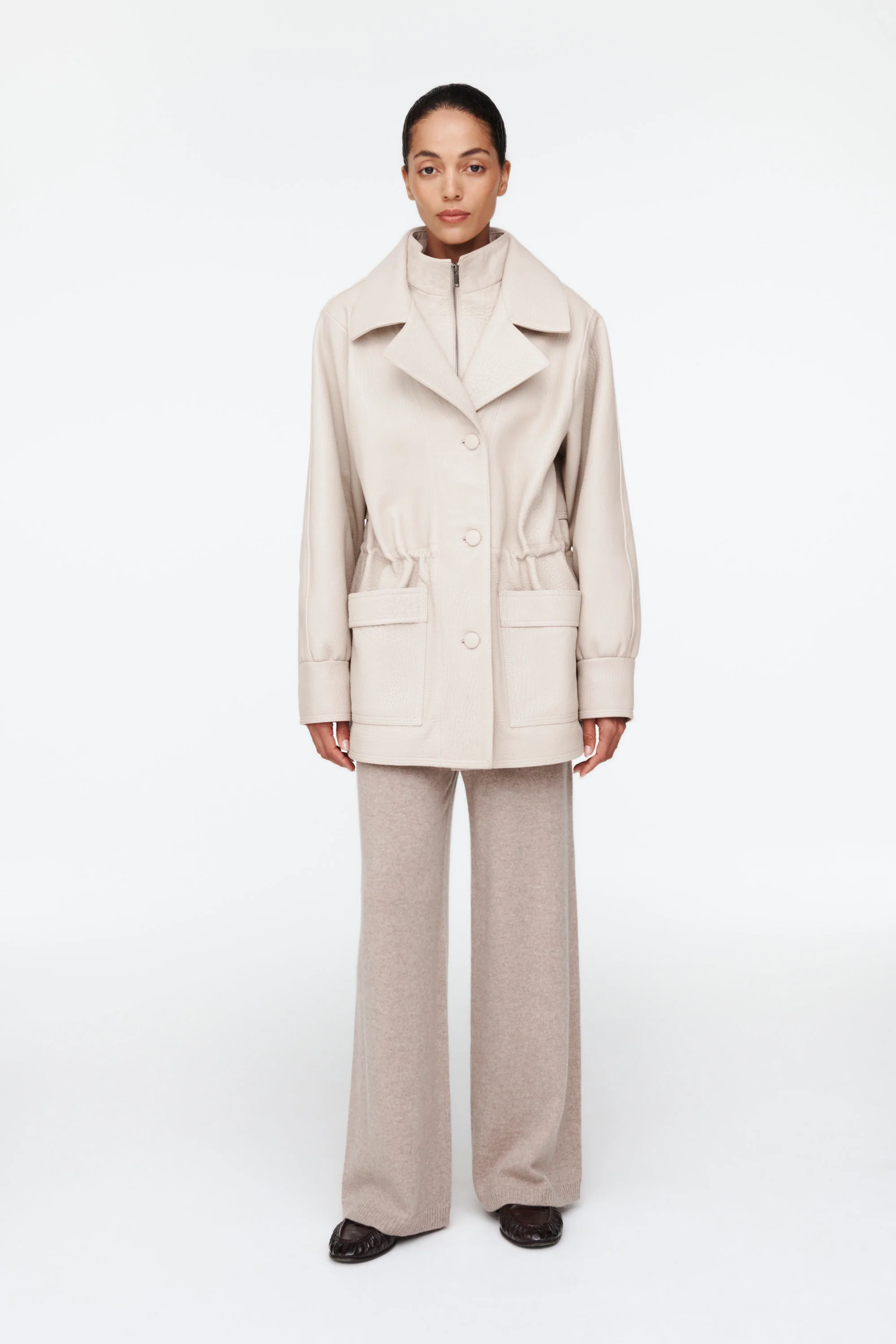 A beautiful double collar leather jacket, use the draw cord to cinch the waist for an effortlessly relaxed look.