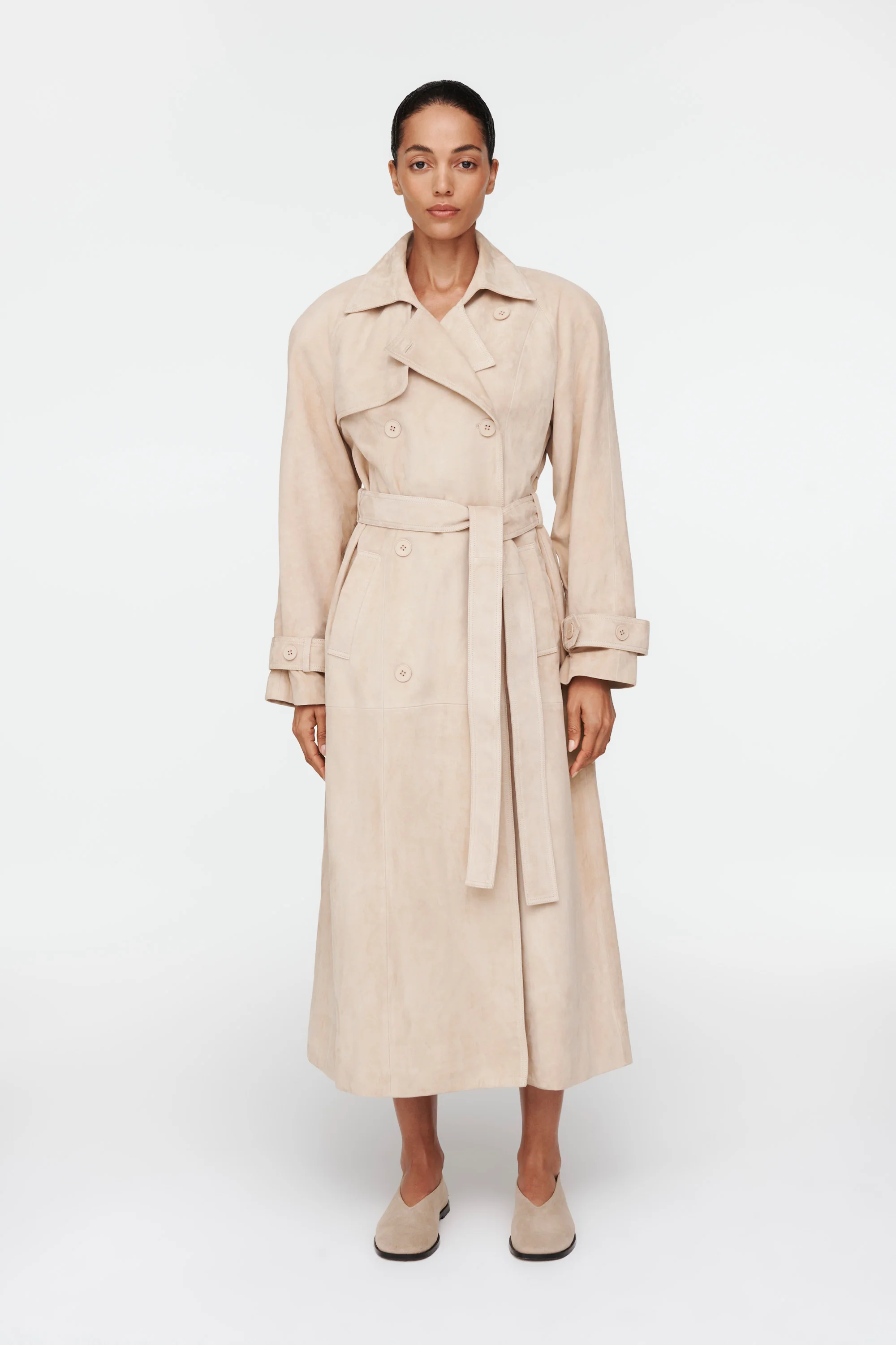 This coat will get you noticed. The incredibly soft, high quality suede leather is beautifully tailored into a classic double breasted trench complete with storm flap and leather sash. This cocooning coat will be a constant in your wardrobe.