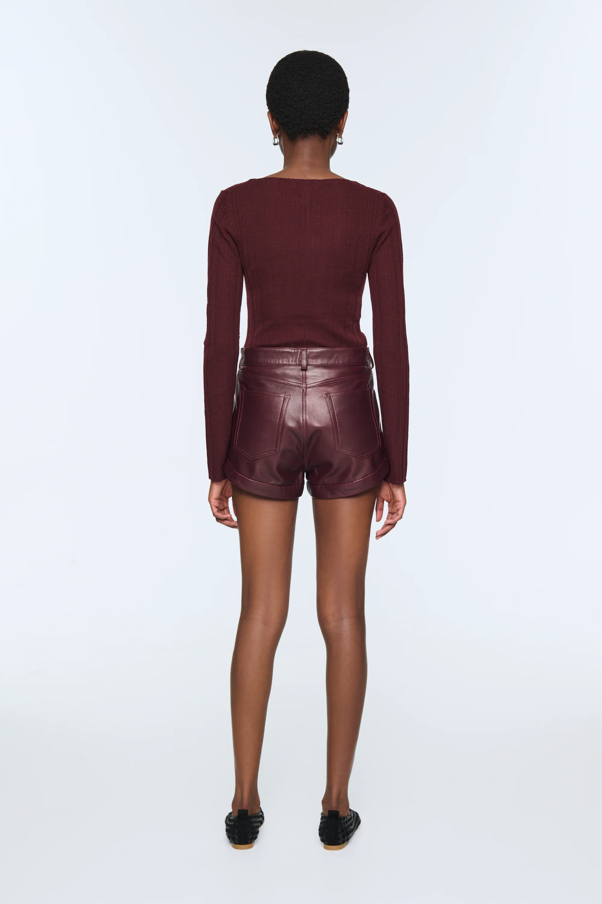 We adore these leather shorts boasting a denim-style look, sure to steal the spotlight in your spring wardrobe. With timeless details and a high-waist cut, this pair features rolled hems for added flair. They seamlessly transition from casual to dressed-up with a quick shoe change, or pair elegantly with tights for added versatility.