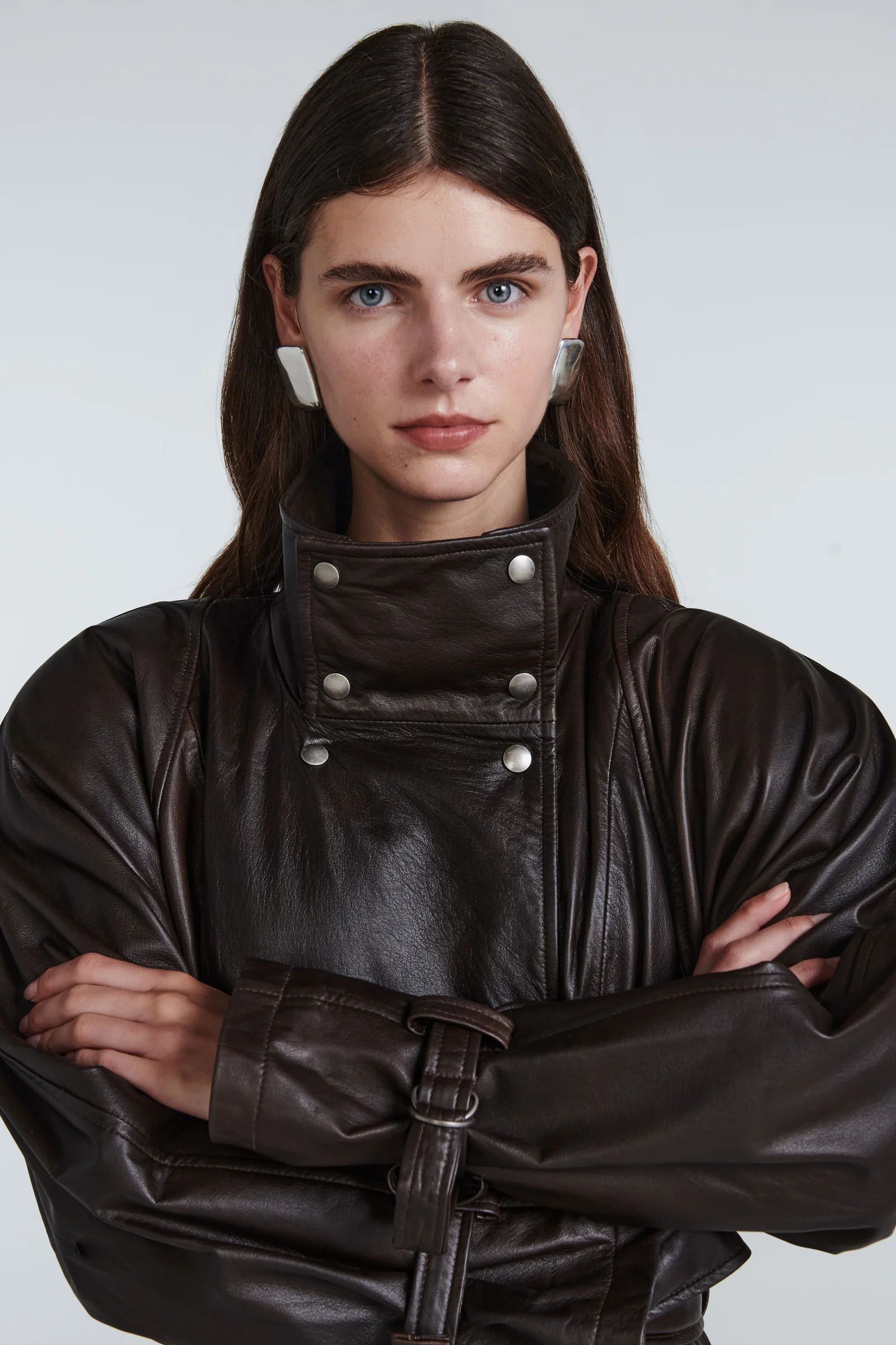 This gorgeous longline trench coat is meticulously crafted from supple leather, offering both durability and luxury. It features a striking neckline and an adaptable collar, which can be styled in multiple ways thanks to the innovative use of pop fastenings.