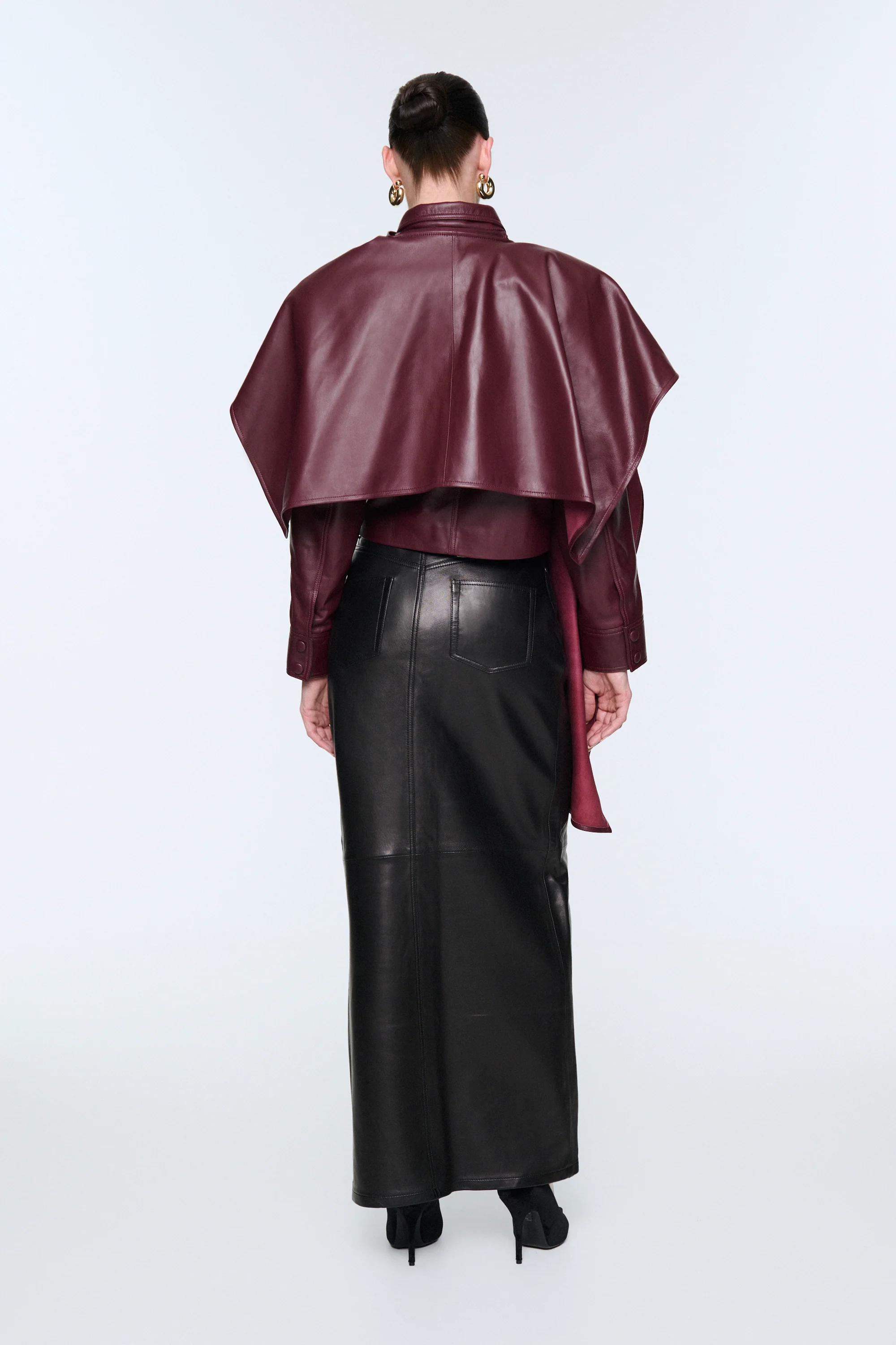 We adore this stunning box-cut leather jacket featuring a detachable scarf. Crafted from incredibly soft, high quality leather, this jacket boasts a cropped waist and a statement scarf that can be removed. Its flattering cut ensures you'll look chic all year round, making it perfect for transeasonal wear.